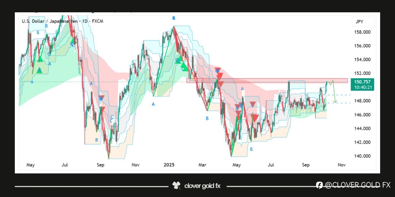 USDJPY 1D chart shows a impulsive structure followed by a corrective pattern forming an ABC wave sequence. After completing the C wave near the major horizontal resistance aligned with the Fibonacci r...