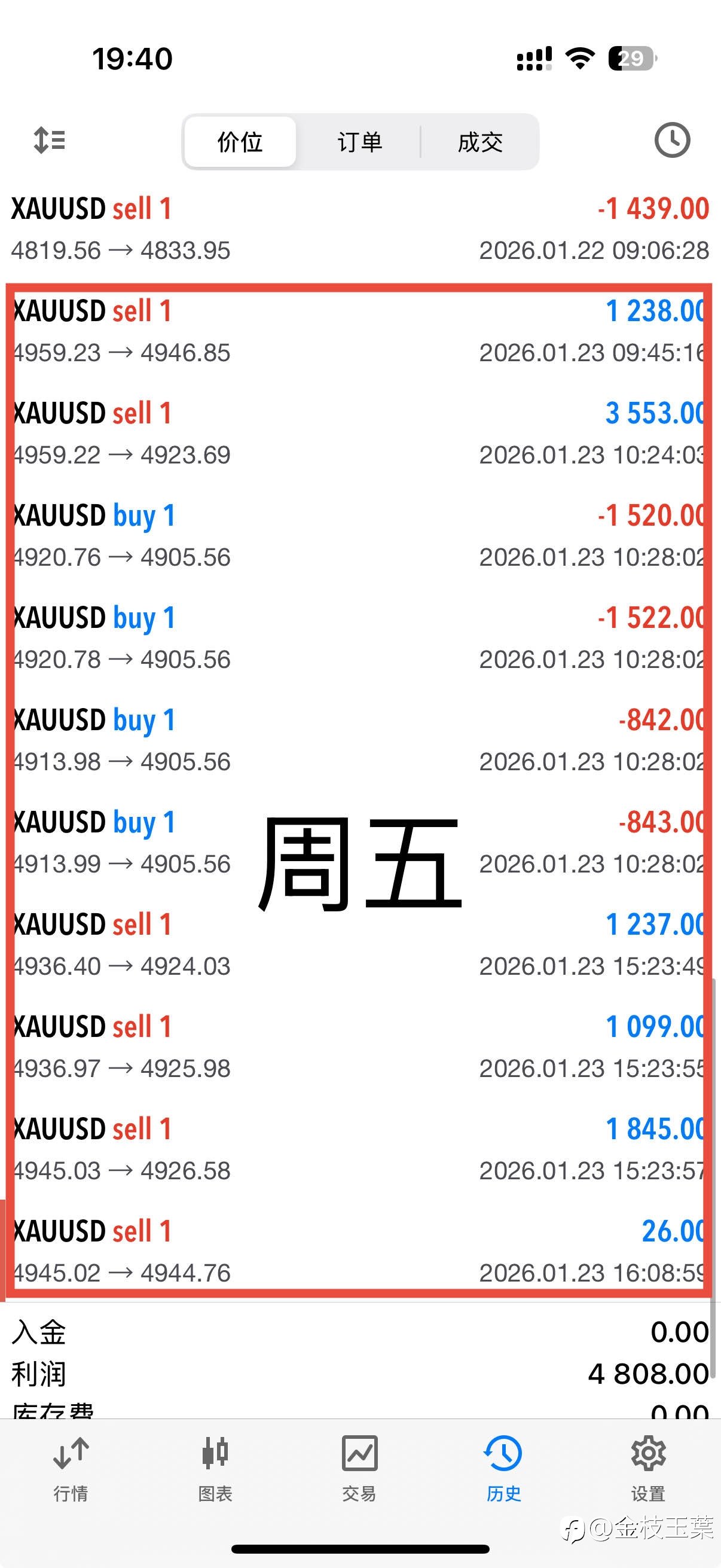【本周结束,短线拿下48 点】 本周开仓12笔,整体小赚结束,短线落袋4800刀。 本周周一开始受消息面的影响一路走强,整体单边上涨360点,金价临近冲击5000大关,其中周三整体拿下较好,可...