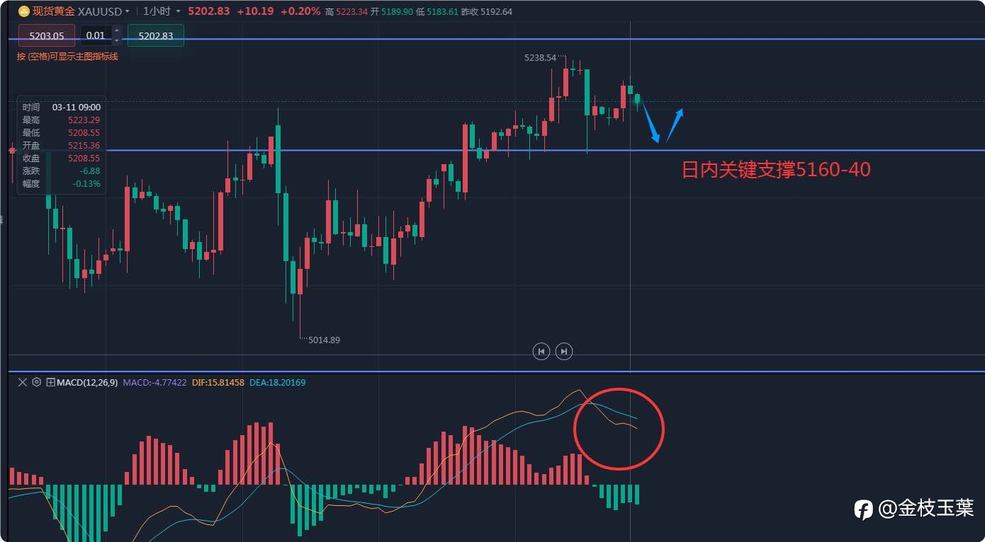 【3/11日内思路】 目前金价延续昨日上行动能,收阳并处于日均线上方,同时4小时均线呈金叉不断上行日内多头主旋律不变。但1小时周期MACD不断放量,有持续回落的信号,同时今晚有CPI数据白盘...