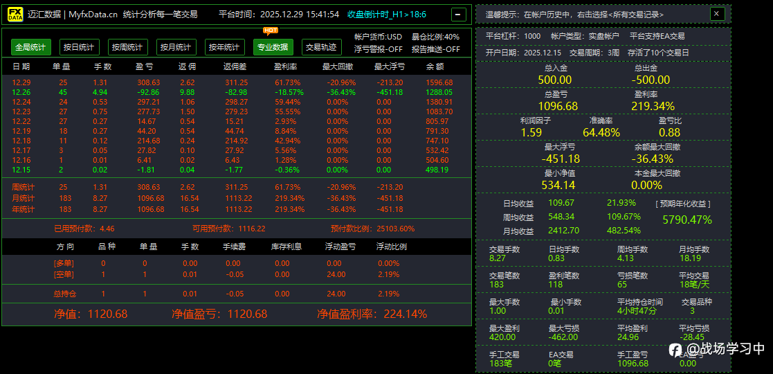 最近交易,截至至11月底前还算顺利,实现小幅盈利;机会看起来大概率不是很好,适合打短! 食之无味,弃之可惜的行情。干脆12月躺平,暂不交易。 在本月,从自责自己错过黄金自八月底开启的一波大牛市,内心郁闷之余,恨不得扇自己两巴掌! 慢慢,我接受自身谨慎性格弱点,也是优点,它使得我持续存活在牌桌,同时也让我在牌桌上难以获得巨额利润。 不知不觉,也会回想起初识这杠杆市场,当时我的第一反应:骗局?赚钱都很容易,而这市场恰恰给人赚钱很容易的错觉! 后来一边工作,一边小额投入....一边学交易(姑且称之为学,懵懵懂懂技术分析、缠论、指标等等)。 学习的是交易的方法,现在的我把之称之为:所谓的技术分析~~~