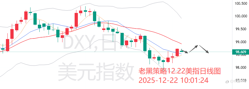 12.22外汇、黄金、原油分析策略: 【美指】 美指上周初先延续弱势,回撤低点至97.8一线附近,后半周行情回升反弹,周五更是以一阳线冲破10日线阻力。从日线结构上来看,美指短线走势偏强,站稳5、10日均线上方,短期内回升趋势虽有延续可能,但短期内也要面临前一波低点98.8以及20日线99附近压力测试,且如果不能突破这两个压力位,那么美指主体结构依然还是弱势趋势。 本周圣诞假期周,市场可能会因假期效应而表现清淡,故本周思路以看震荡修整为主,但在周二晚间美GDP数据公布,届时也要多加留心关注,以防市场借机出现异动风险。非美货币方面本周也保守多看少动。 【黄金】 黄金上周初先居高震荡,下半周虽再有