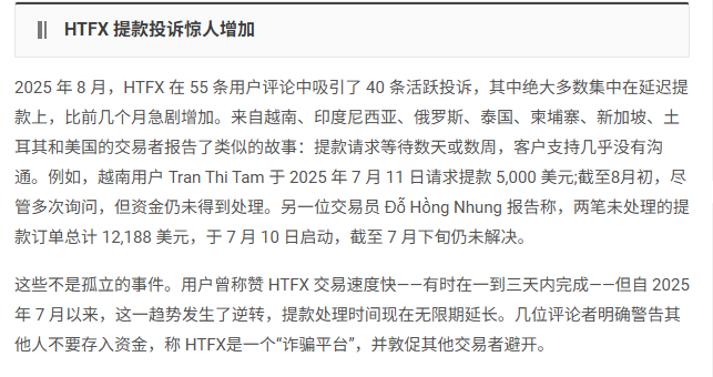 还记得几年前口碑还不错的外汇平台HTFX吗? 最近,它又成了圈内热议的黑洞话题。有人说提现拖延、账户被冻结,官方却喊冤:“是假网站搞的。”真假难辨,那这场风波,究竟是怎么来的? 提现卡壳:从“延迟”到“久等不到账” 今年8月起,多个国家的交易者在社区平台发帖反映——HTFX提现开始异常。 越南、泰国、新加坡、印度、俄罗斯等地用户纷纷表示,提交出金申请后迟迟不到账,客服回复永远是“请耐心等待”。 有交易者称自己在7月中申请提现 5,000 美元,到9月仍没到账;另一位用户报告两笔共 12,000 美元的订单自7月起也无进展。原本被赞“出金快”的 HTFX,这次却陷入“出金慢到怀疑人生”的泥潭。