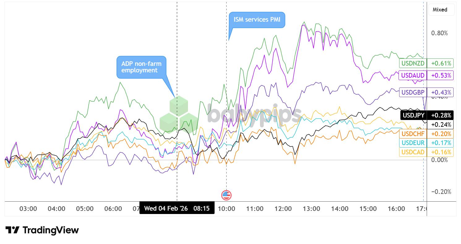Partner Center Mid-tier U.S. data presented a nuanced picture of the economy, with the services sector maintaining steady growth while private sector job creation slowed to a crawl in January, prompting mixed movements in the U.S. dollar across major currency pairs. Key Takeaways ADP National Employ