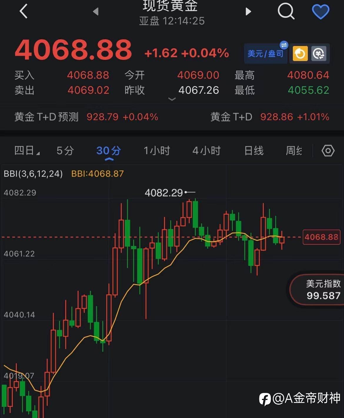 下午好。现货黄金建议现价4068-4065附近买个多、损4061,目标10-20个点