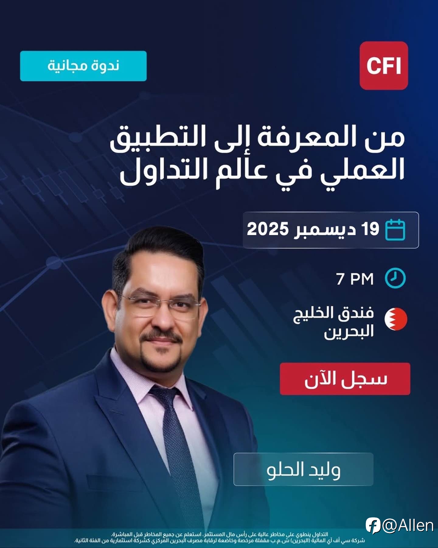 。 CFI巴林公司将于2025年12月19日晚上7点在巴林海湾酒店举办由专家Walid Hilo主持的免费研讨会“从知识到交易实践”。