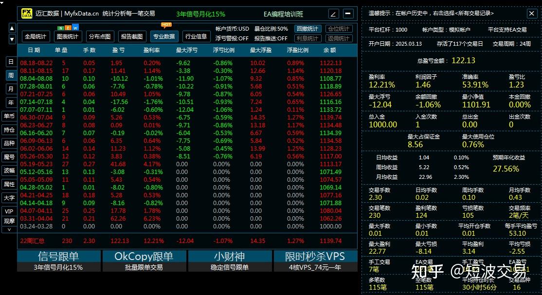 一个更高手人士看了我的实盘运行帐户后,做了详细分析后,写了一个真实的评估愽文,在此也分享与你,有兴趣的可进一步的交流。 策略A独立运行:单量119,总手数1.19,最大手数0.01,利息成本-3.56美元,盈亏金额54.40美元,盈利率5.44%,准确率63.03%,盈利比0.79,利润因子1.35。 策略B独立运行:单量104,总手数1.04,最大手数0.01,利息成本-3.05美元,盈亏金额53.20美元,盈利率5.34%,准确率43.27%,盈利比1.89,利润因子1.35。 混合运行统计:初始资金1,000美元,总净盈利122.13美元,利润因子1.46,最大回撤40.14美元(3.5