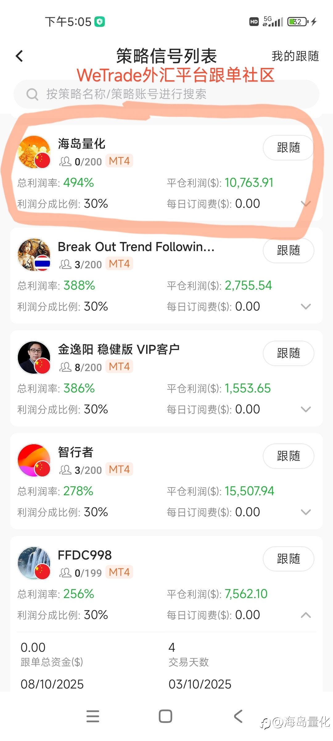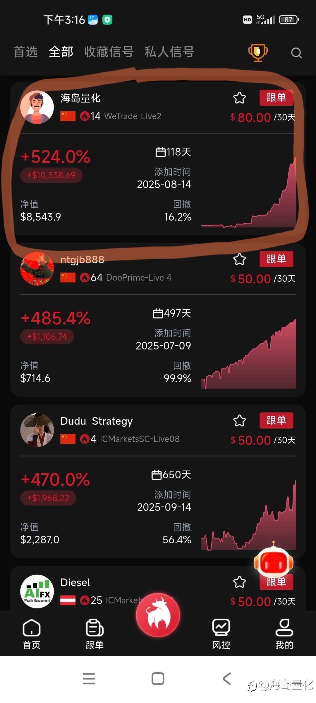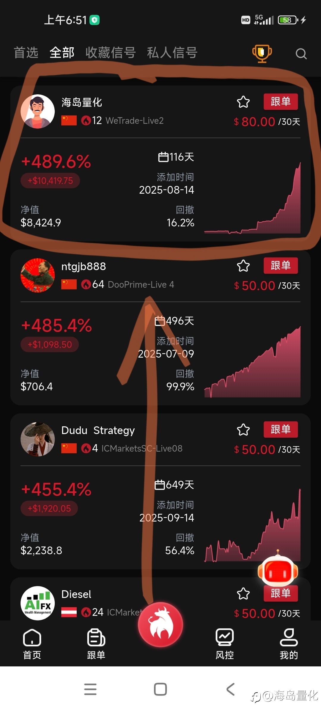 【我不说大家可能不知道】第一张图我圈出来的两个平台,可以说是国内最大的,一个是followme交易社区,另一个是k站。而我们海岛量化公司,可是这两个平台上的大明星,目前我们在比赛上第一名。在k站上面,我们的排名...