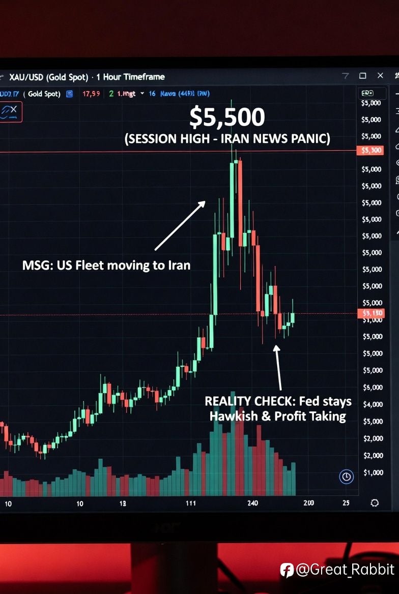 昨晚黄金从天堂到地狱的史诗级波动,足以载入金融史册。 很多人问为什么?简单来说,就是一场**【战争恐慌】VS【现实冷水】**的巅峰对决。这种级别的波动,根本不是散户能决定的,这是全球顶级资本在激烈博弈。 👉 为什么暴涨上$5500? 因为“怕”。美军舰队、伊朗、特朗普的威胁……市场第一反应就是中东要全面开战了。在极度的战争恐慌下,黄金成了唯一的救命稻草,资金不计代价地疯狂涌入。 👉 为什么又突然暴跌? 因为“醒了”。几个小时后,大家发现: 仗还没真打起来,刚才吓过头了,溢价要回吐。更现实的是,一旦开战通胀重来,美联储绝对不敢降息,高利率像大山一样压得黄金喘不过气。 对于我们普通人的意义: