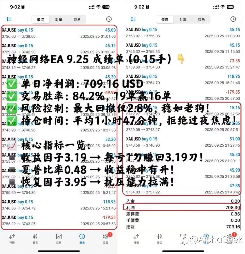 神经网络EA交易日报(9.25):单日胜率84.2%,最大回撤2.8%,净利润709.16 USD(0.15手) 策略亮点总结: 策略类型:纯AI驱动,非马丁、非网格,全自动执行 交易品种:专注XAUUSD(黄金),擅长捕捉波动行情 持仓...