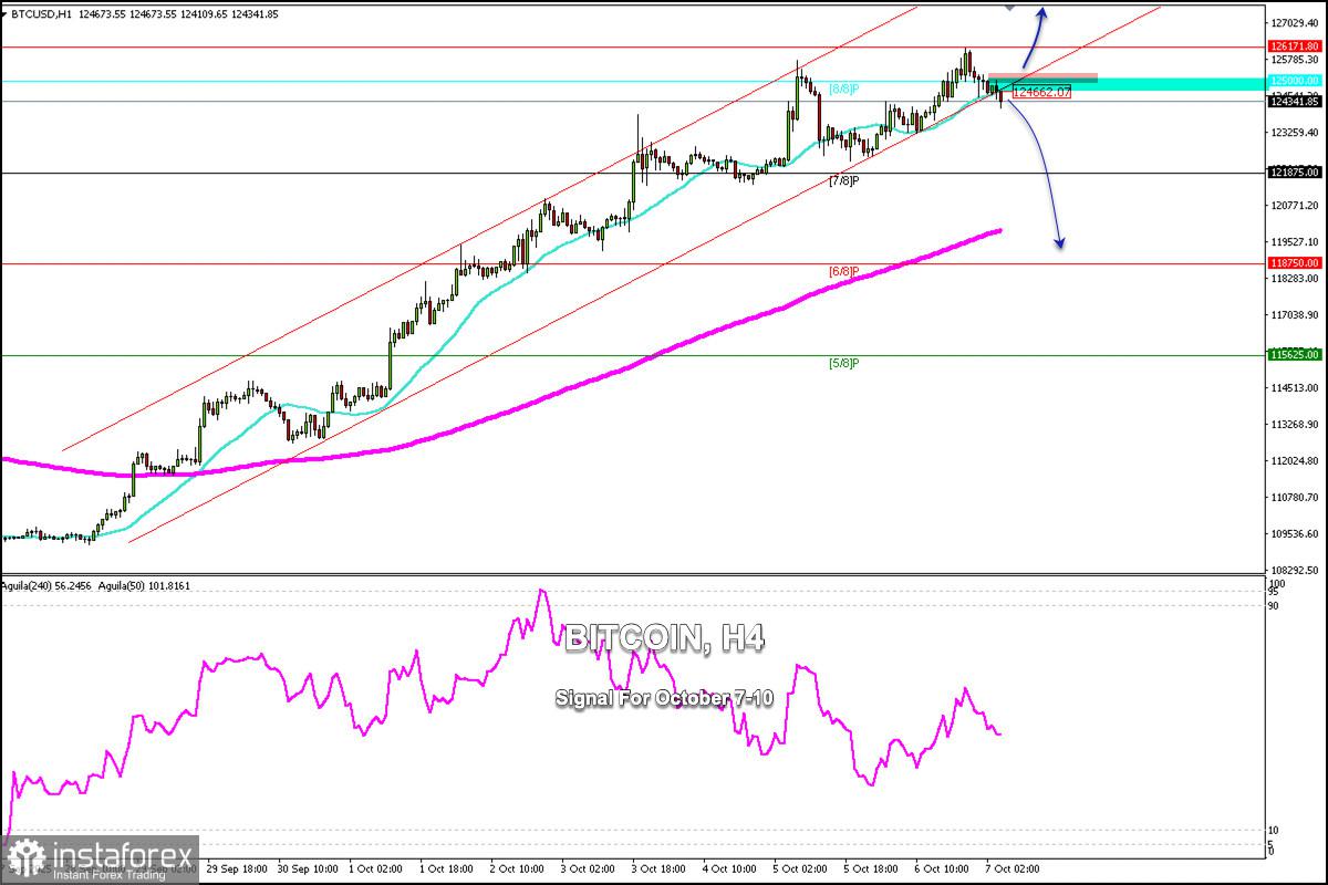Bitcoin mencapai level tertinggi baru di 126,171. Setelah mencapai level ini, Bitcoin mengalami koreksi teknikal yang kuat, menembus channel tren naik yang terbentuk sejak 29 September. Kami yakin bahwa dalam beberapa jam ke depan Bitcoin dapat mencapai level Murray 7/8 di sekitar 121,875. Level ini