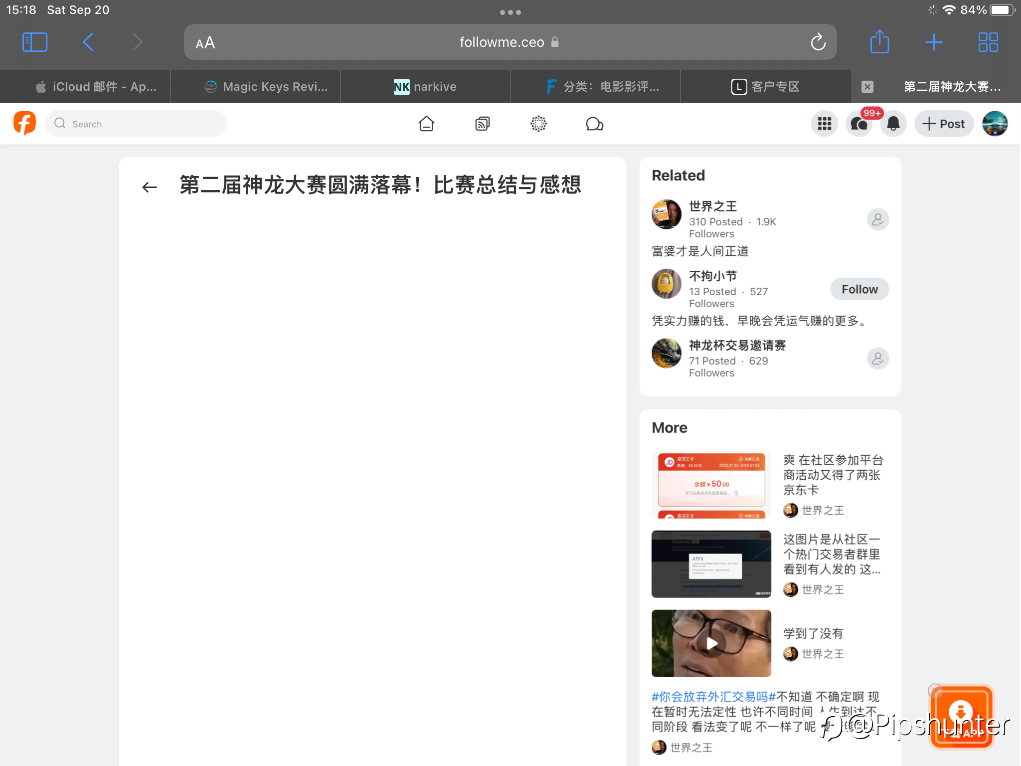 感谢全社区最靓的两个大佬 @郭嘉买彩票 @不拘小节 ,也有人喊他们叼毛,喷子太多了。 神龙杯落幕,拿了7百多刀奖励,感谢大佬送的福利。 第二届“神龙杯”交易比赛,以五十天的交易时长“比亏损,谁先爆仓谁第一”的特殊规则,12名交易者上演了一场充满挑战与反思的实战。比赛中,首次开仓限制为 5%,且一天只能开一次总仓为13%,这样的规则设定想要一下子爆仓真的只能靠实力了。妇女之友 @世界之王 作为