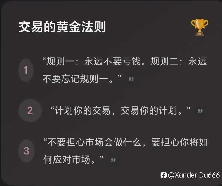 交易不仅是数字与图表的游戏,更是心智与纪律的较量。 核心交易原则 关于风险与损失 “风险来自你不知道自己正在做什么。” “在投资中,赔钱不能盈利,但能使投机者细心钻研。” “判断对错并不重要,重要的在于正确时获取了多大利润,错误时亏损了多少。” “你的最大敌人是你自己。” “希望不是一种策略。” “不要问理发师你是否需要理发。” “不要一看到报纸、杂志刊出什么利多题材,就一头栽进去。” “不进行研究的投资,就像打扑克从不看牌一样,必然失败。” “在别
