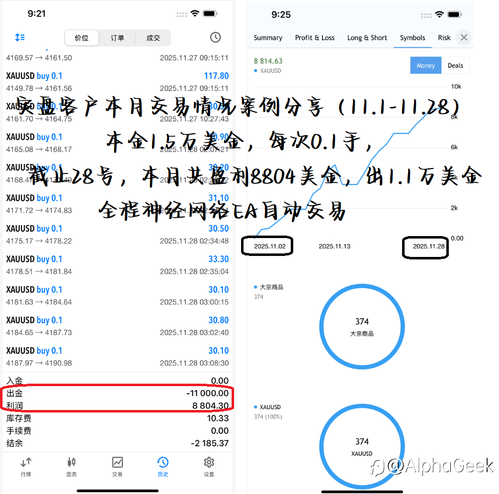 实盘客户本月交易情况案例分享: 本金1.5万美金,0.1手/笔,全程神经网络EA自动交易,11.1-11.28,共盈利8804美金, 不熬夜,不盯盘,24小时自动捕捉机会