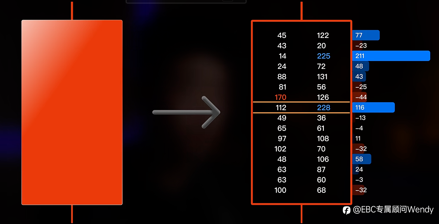 足迹图(four punch chart)是基于Tick数据的订单流分析工具,本期内容主要介绍足迹图的基本概念与应用方法,重点讲解其核心构成元素包括主动买方成交量(ask volume)和主动卖方成交量(bid volume),以及Delta值的计算与市场含义。通过观察关键支撑位与阻力位上的订单流行为,结合Delta变化,可辅助判断价格反转信号。同时建议将足迹图与其他指标如未平仓合约量(open interest)和累计成交量Delta(CVD)结合使用以提高分析准确性。 一、足迹图基础概念 足迹图是一种基于订单流的数据分析工具,能在K线内展示每个价位的买卖成交量细节,相较于普通K线,能揭示微