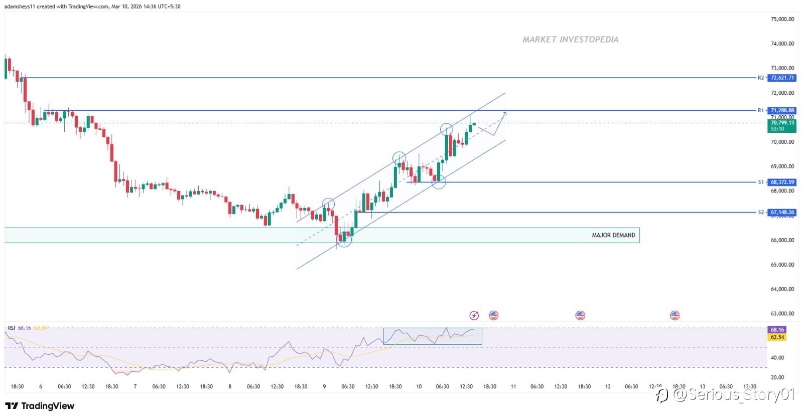 *Overview:* BTC is currently trading within a rising parallel channel, indicating a short-term bullish structure after rebounding from the major demand zone near 66,000. The price has been forming hig...
