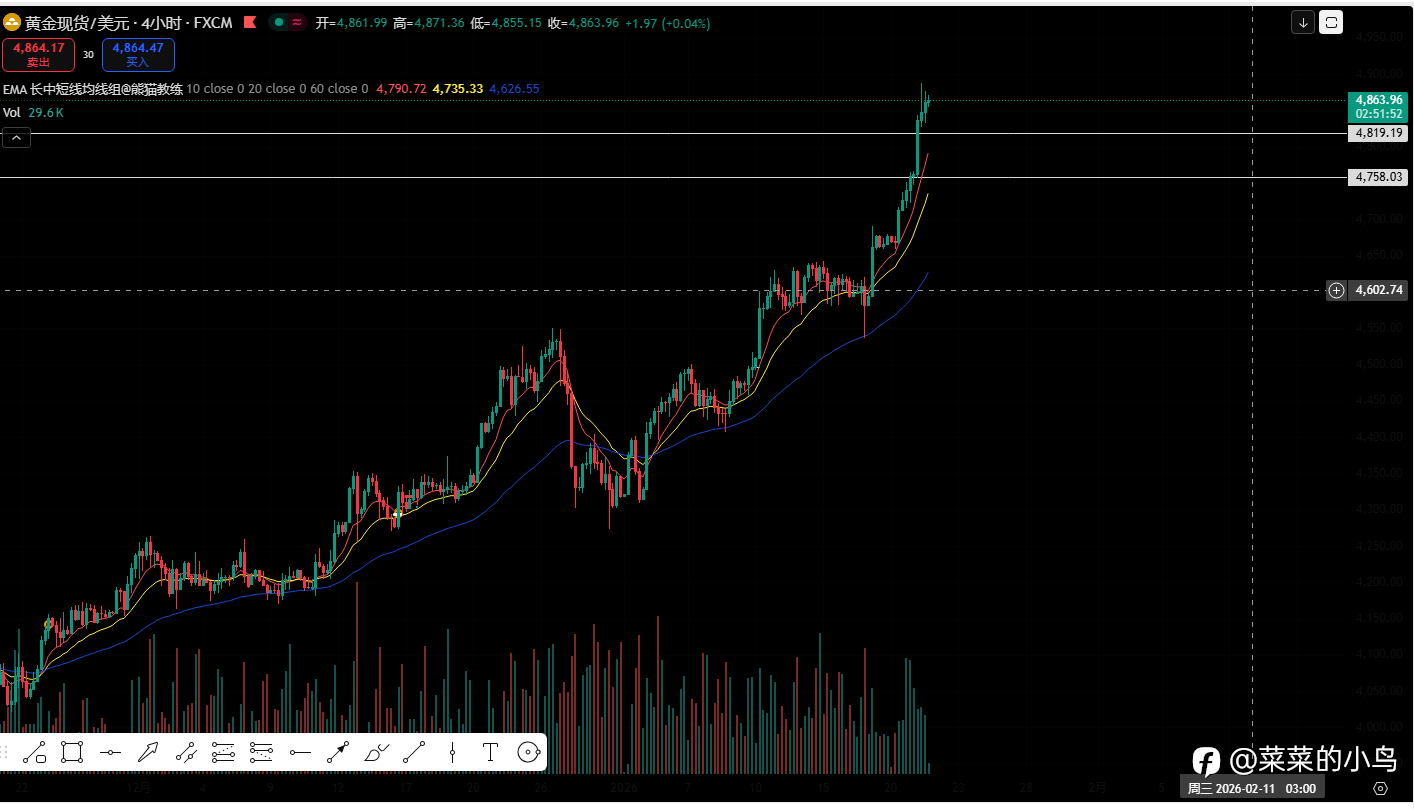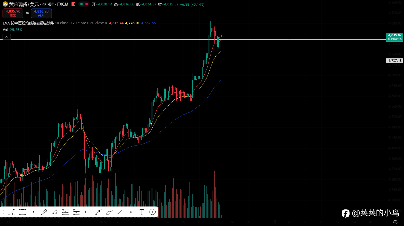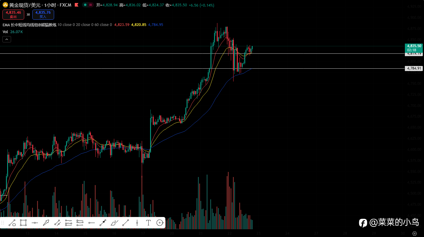 昨天晚上清仓0.01手,今天下午4点跌破15分钟20均线清仓0.01,目前持有底仓0.01手 目前计划, 昨日今日两根大阳直线拉升,目前要小心追多,防止回调修正, 回踩4820,接多0.02手,止损8个点,如若打损看后续行情 回踩...
