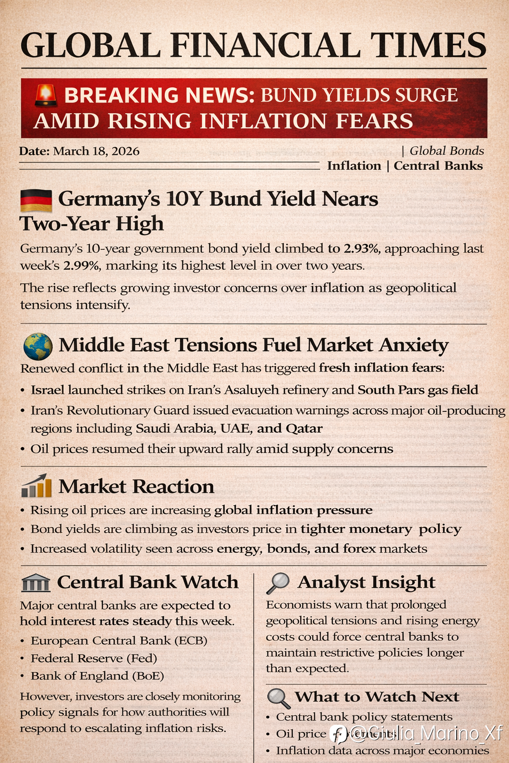 🚨 BREAKING NEWS: BUND YIELDS SURGE AMID RISING INFLATION FEARS Date: March 18, 2026 Category: Global Bonds | Inflation | Central Banks 🇩🇪 Germany’s 10Y Bund Yield Nears Two-Year High Germany’s 10-year government bond yield climbed to 2.93%, approaching last week’s 2.99%, marking its highest level