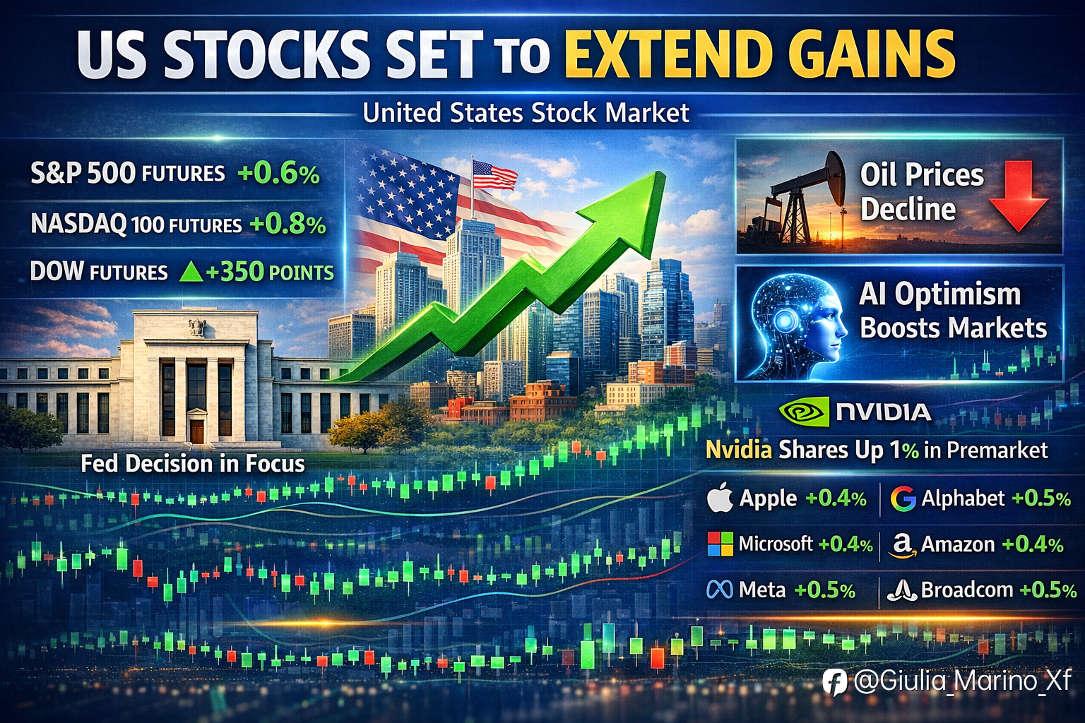 US Stocks Set to Extend Gains US futures moved higher on Wednesday, with contracts on the S&P 500 rising 0.6%, the Nasdaq 100 gaining 0.8%, and Dow Jones futures climbing nearly 350 points. The advance marked a third consecutive session of gains as investors braced for the Fed’s monetary policy