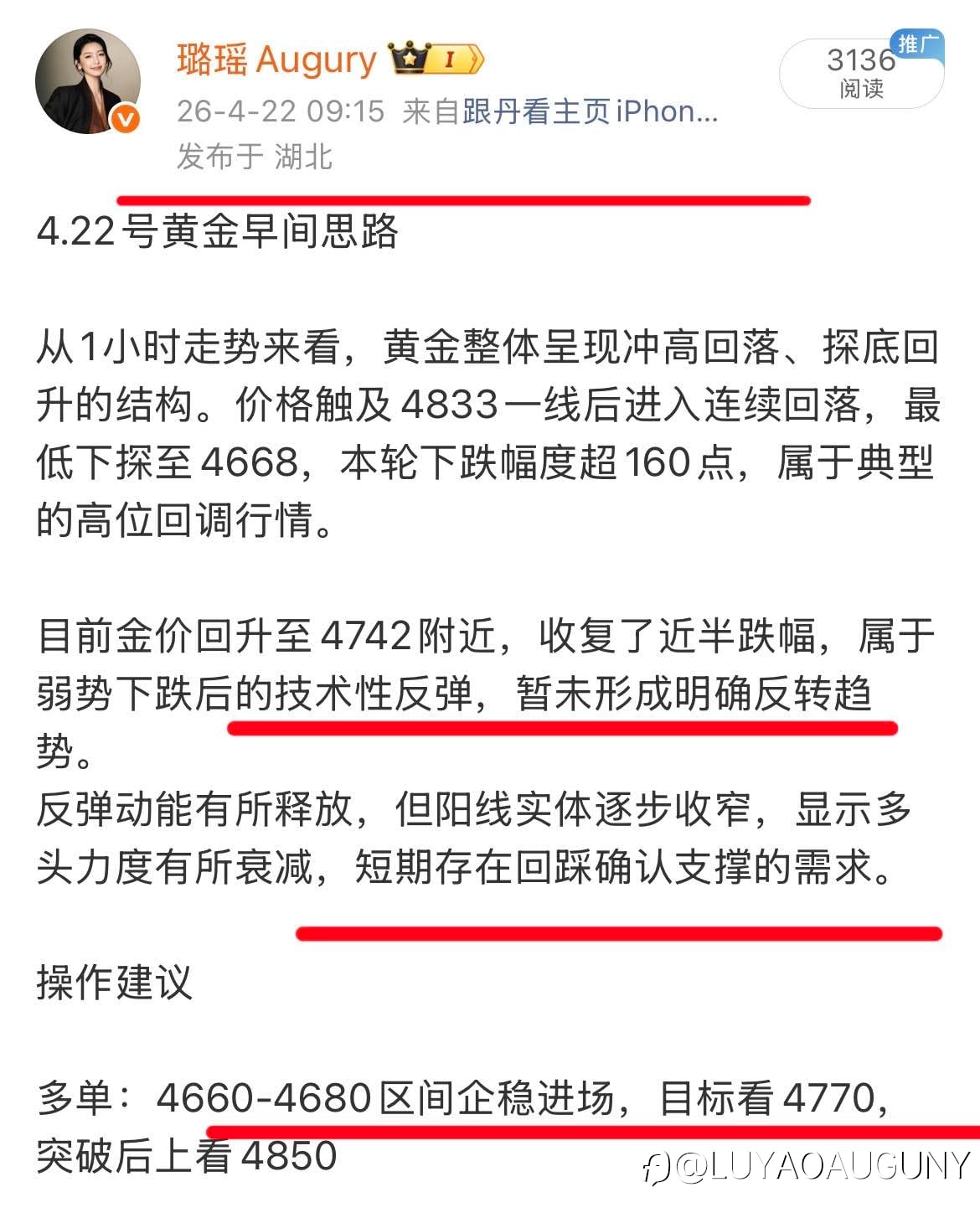 黄金震荡区间璐瑶已精准给出位置 从低位4668到目前的4772,已有100典空间