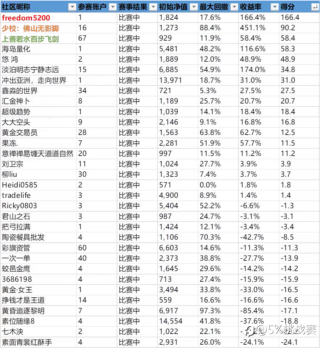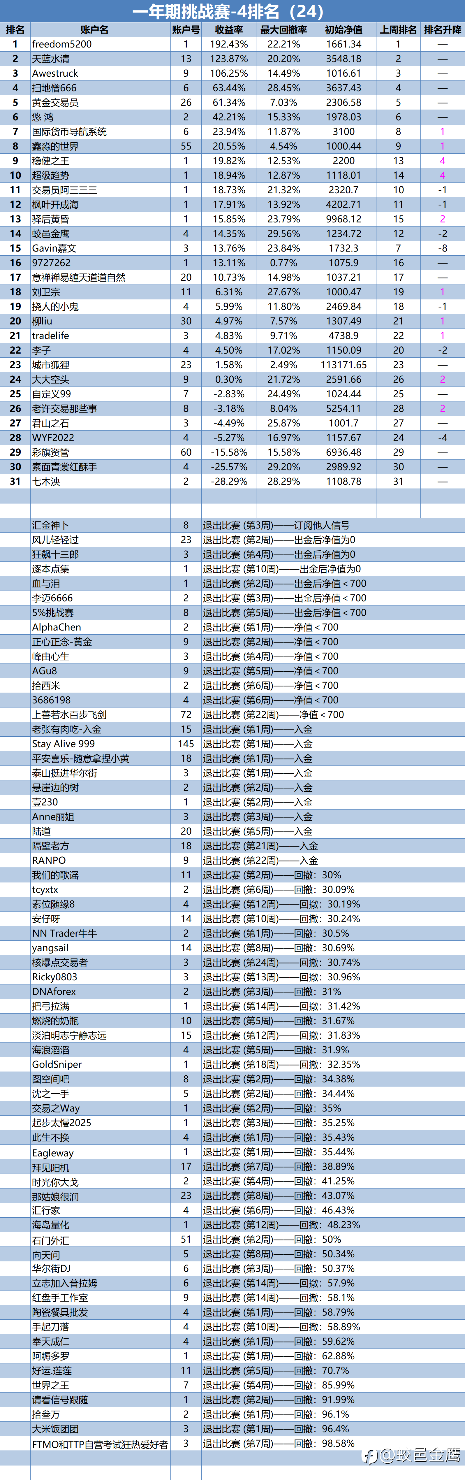 一转眼,2026年又过去了十天。 黄金继续发烧,周五收盘再次落到4500上方,并且在周一继续遥遥领先。 5%挑战赛排名变化不大,飞剑取代海岛量化,来到了第三名。 但整体积分超过100的,依然只有第一名。 另外,又有几位参赛选手遗憾淘汰,可见取得良好盈利的同时能保持小亏,非常不容易。 最近交易频率下滑后,我逐渐醒悟的重要一点:追逐他人成功是个灾难。 这就是困惑我长达十几年的事。 交易里,不断去追逐他人的成功,很少去真正清晰感受到自己的舒适区。 于是从日内短线换到波段,或者长线,又学习套利,量化,资金管理。 对于他人似乎都能成功的事情,自己学了就更废。 社区有不少小伙伴