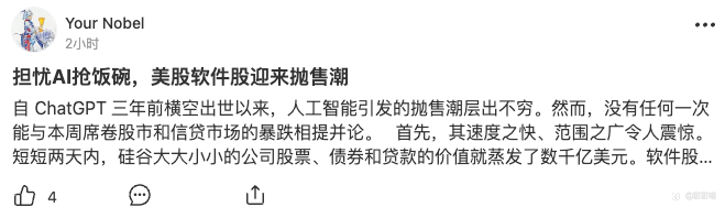 1.@小蚂蚁不想爆仓 熬过至暗时刻靠实力回本太不易,市场的教训终成你的铠甲,新年定能顺风顺水账户长虹💪 2.@Your Nobel AI 引发的科技股暴跌,本质是市场对技术颠覆商业逻辑的估值重估,短期波动是变革前的必然,长期终会筛选出真正的价值创造者。 3.@交易员纪盈时 @老杨丶 @诸葛先生点金 连刷三位大佬,你们怎么看,觉得怎么做 4.@马吵吵 这是我的世界吗 可以和楼上互动一下 5.@ATCN 当前美国天