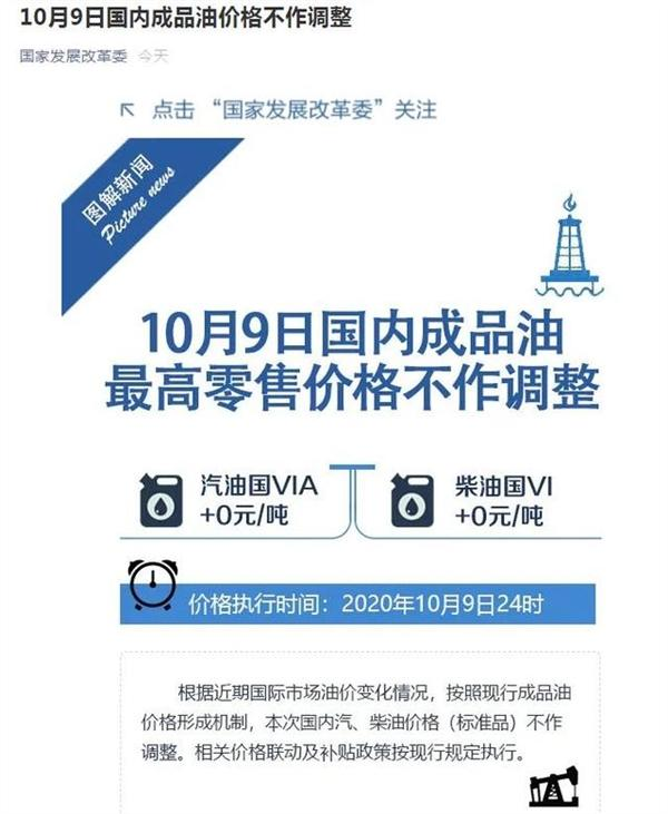 10月9日消息,据“国家发改委”微信号9日消息,根据近期国际市场油价变化情况,按照现行成品油价格形成机制,本次国内汽、柴油价格(标准品)不作调整。