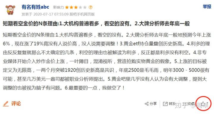 由于被关小黑屋,文章一周没发FX123财经导航 苏胜阳读财导读:民间汇神做空黄金的4天!自古乱世出英雄。江湖一乱,就需要有大豪杰来拯救苍生。牛市欲来,千军齐动,正是英雄辈出的时代。01大风起于青萍之末,汇神生于草莽之间。逛个贴吧的功夫,说不定你就碰上了民间汇神。有名有姓的民间汇神,洋洋洒洒300字。思路严谨,文笔独特。6大看空理由,有理有据,斩获7个大拇指。文中引用了大机构,大牌分析师,也引用了非专业媒体等顶级术语。看到这里我不禁想起,曾有个香港富豪参加活动向马云炫耀自己是香港顶级。其实民间汇神并不在意这些粗枝末节,他最看重的是最后一条,因为他做空黄金了!任何大牌,任何顶级,都是陪衬。网友更是