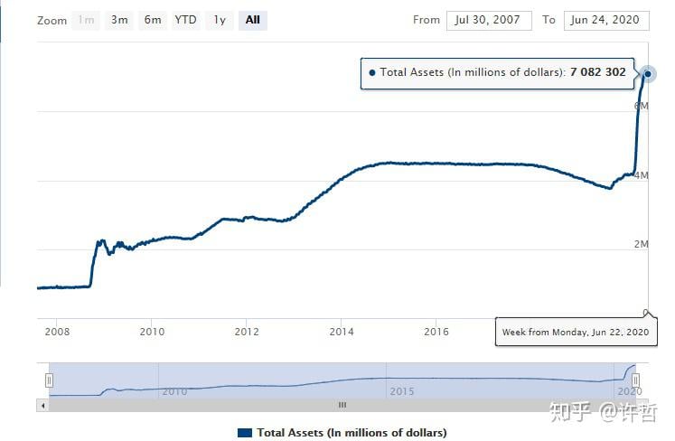 美联储本轮“放水”,最早可以追溯到今年年初。从2020年2月26日起,美联储的资产负债表已经从4.2万亿美元增加到