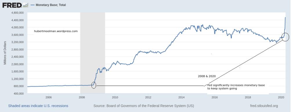在2008年金融危机期间,美联储大幅增加了基础货币,以防止金融体系崩溃。而现在,他们正处于类似的情况,并采取了同样的做法。