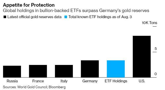 投资者非常担心全球前景,以至于全球黄金ETF的持仓量在超过德国持仓量后仅次于美国官方的黄金储备量。