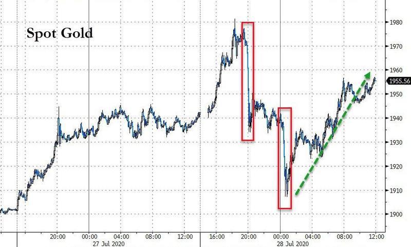 行情数据显示,现货黄金价格周二上演过山车行情,亚洲时段盘初一度刷新历史高位至1980.80美元/盎司。不过此后却好景不长,在亚欧时段出现了两波短时跳水行情,价格也一度跌至1910美元。不过,好在此后多头再度重整旗鼓,最终在纽约尾盘收于1957美元/盎司附近,再创收盘纪录新高。