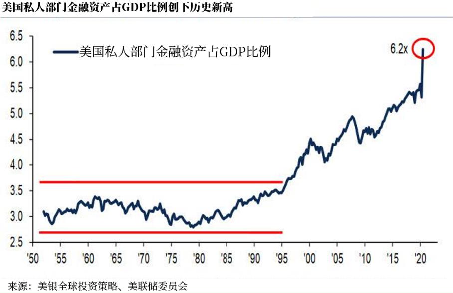 在最新的流动性报告中,美银首席投资策略师哈特奈特指出,目前美国私人部门金融资产价值已经是GDP的 6.2倍,为历史最高水平。去年8月,该比例为 5.5倍,而1950-2000年间的正常水平为2.5-3.5倍。