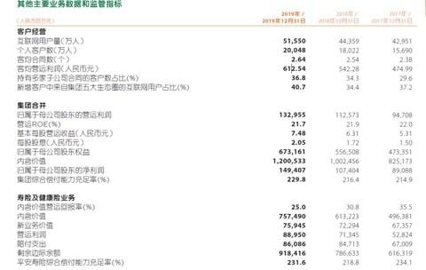2020年2月20日中国平安在收盘后发布了2019年的年报,公司归属于母公司股东的营运利润1,329.55亿元,同比增长18.1%,营运ROE为21.7%(18年数据为18.9%、21.9%);归属于母公司股东的净利润1,494.07亿元,同比增长39.1%(18年为20.6%)。个人业务营运利润1,228.02亿元,同比增长25.7%,主要得益于客户数量和客均营运利润的稳步提升,个人客户数较年初增长11.2%,客均营运利润同比增长13.0%;个人客户数达2亿,新增客户3,657万,其中40.7%来自集团五大生态圈的互联网用户。