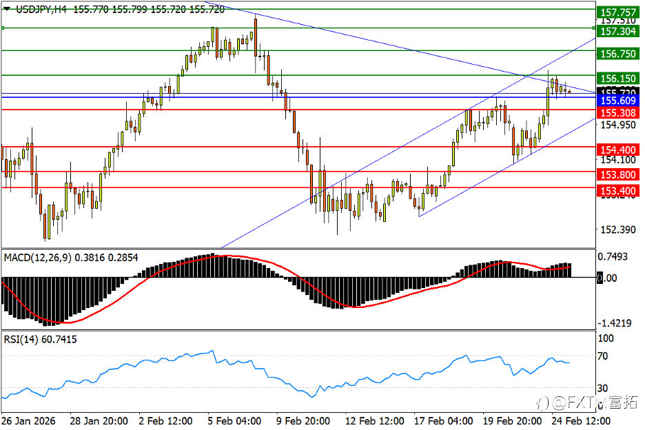 NO.1 美元/日元 (USD/JPY) – 高市表达加息担忧,冲击近月高点连线 日线图看,因高市早苗对央行加息前景表达担忧,日元隔夜突现跳水。美/日扩大过去两周来的反弹势头,同时逼近1月23日和2月9日高点连线压力。如果连同去年12月10日高点/1月6日低点镜像位156.15一并攻破,将是开启更大回升空间的信号。后续阻力依次参考2024年11月反弹高点156.75,1月5日震荡高位157.30,以及去年4季度月高位区157.75。指标境遇伴随汇价反弹显著改善,MACD金叉后快线升近零轴;RSI重返强势区。 4小时图看,美/日正站在短、中趋势逆向交汇的敏感节点。下行风险来看,1月2