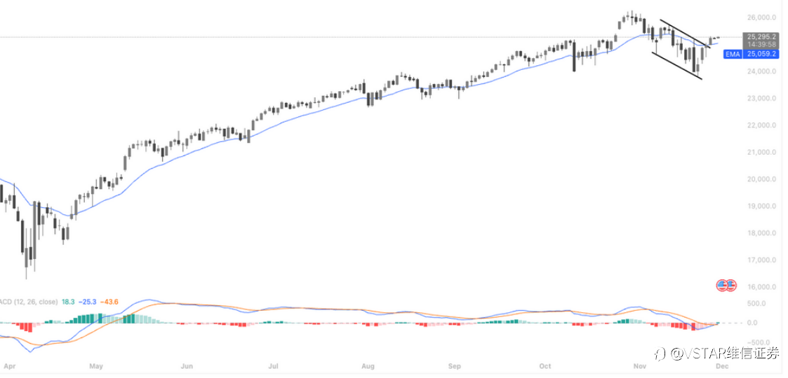 大盘回顾 降息预期升温与AI基建共振强化,市场情绪维持承接 尽管美国因感恩节假期休市,交易提前收官且流动性偏低,但股指期货仍保持温和上行:道琼斯期货涨0.03%,标普500与纳斯达克100期货涨幅不足0.01%,并未出现假期获利回吐迹象,显示市场短期抛压有限、承接稳健。 宏观定价层面,CME FedWatch 显示美联储12月降息25bp的概率升至86.9%,进一步强化“12月宽松落地”的一致预期。摩根士丹利策略师指出,美国经济放缓与通胀压力缓解将推动未来进一步降息周期,这为新兴市场债提供溢出支撑,而对美股本身则意味着融资成本下行、风险偏好维持。 美元趋势预期也构成中期指引:Pictet预计美
