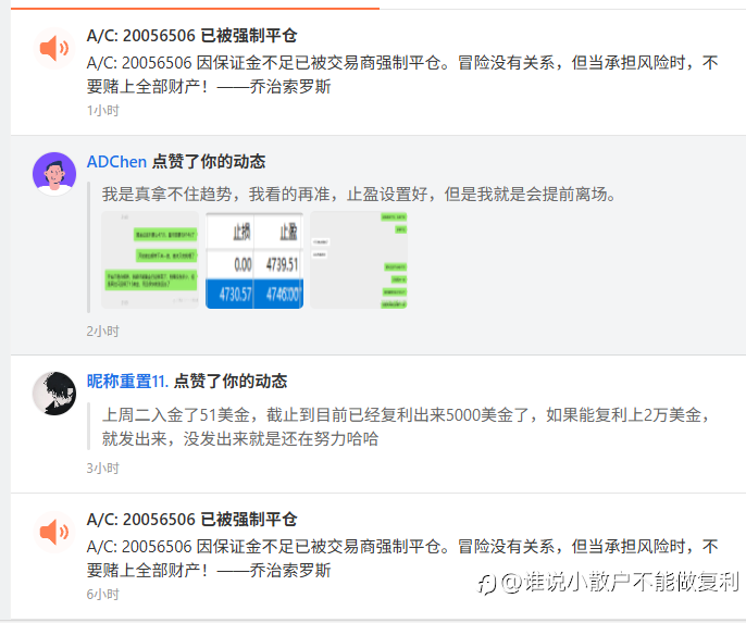 我前半辈子是五毒俱全的chu生。---昨晚领悟。 昨天清闲,盯着盘面看,逆势操作黄金,血亏80多刀。 为什么会这样?我有自己的交易系统,而且写成EA了的---都不用自己动手了、让他自己去运作了,当个翘脚老板都当不好,为什么会去手动? 说白了,这和我的性格有很大的关系,我自以为我是个很自律的人,其实我TMD太看得起我自己的,比起那些赚钱的狠人,我狗屁不是,真的狗屁都不是,问题是我前半生不知道我狗屁都不是,而且很傲慢、非常傲慢。喜欢否定别人、抱怨这、抱怨那。 做事很急,我就是底层穷人,因为穷,就像一个八辈子没吃过饱饭的饿鬼,见什么都想吃,都想要。为什么急?我昨天晚上想了一晚上,急就是贪、所以才会去