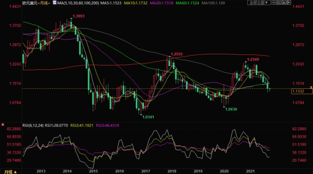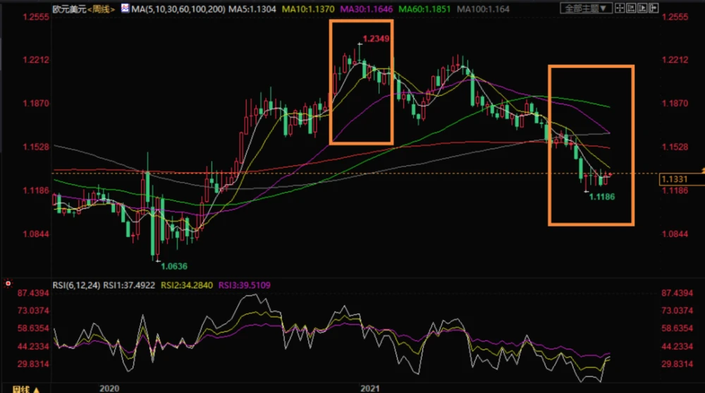 在2021年最后几个交易日,回顾这一年,美元以强劲的走势结束了这一年,这是对美联储启动缩减购债规模决定的肯定。对比之下,欧元这一年就略显沧桑,纵观2021年全年的欧元汇率走势,2021年欧元兑美元汇率走势呈现下跌趋势。 目前看,1月6日欧元/美元触及最高点1.2349,11月24日欧元/美元触及年内低点1.1186。高低区间约为1163点,优于2021年前九个月的687点区间。自9月29日以来,总共增加了约481点。自11月24日在1.11837触底以来,高价已扩大至1.13823(约199个点)。12月的区间更窄,约为138点,高价1.13592和低价1.12208,有很多起伏。 2021年