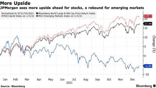 “牛市还没有结束”。 对于美股新的一年怎么走,华尔街的分歧依旧巨大。 摩根士丹利依旧看空美股,认为今年春季美股估值将出现全面重置,而摩根大通则继续唱多美股,该行全球股票策略主管Misla Matejka在2022年就职典礼上发布了一份190页的股票策略PPT,并表示:“保持看多美股,因为积极因素还未耗尽”。 而正如彭博社所指出的,并非只有摩根大通的策略师普遍对股市持乐观观点:瑞士信贷(Credit Suisse)本周重申了对美国股市的乐观看法,法国兴业银行周二重申了对欧洲股市今年回报率为6.6%的预测,并写道“牛市还没有结束”。高盛和贝莱德投资研究所 (BlackRock Investment