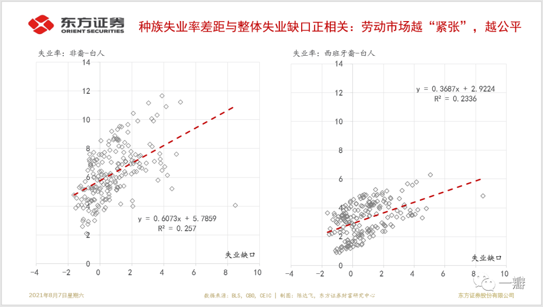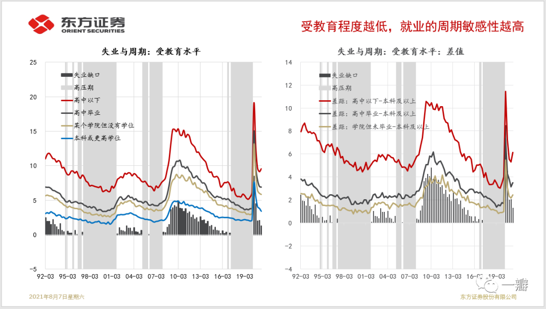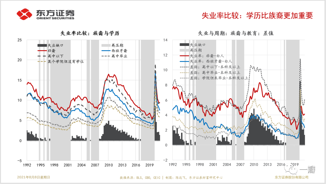 美国7月非农新增就业超预期,整体失业率及其内部结构同步改善(非裔失业率从9.2%下降到8.2%,西班牙裔从7.4%降到6.6%。),这为美联储退出QE奠定了基础(可参考:恃强凌弱的新冠,政治正确的联储——来自美国就业市场的证据;历史的回声、数据的噪声和美联储的“心跳声”)。 对于美国社会和白宫政策而言,分配是主要矛盾。对于美联储而言,就业是主要矛盾。二者的连接点在于,“最大就业”是实现分配正义的最有效途径之一。这不仅要求美联储烫平经济周期,还要求其将劳动力市场尽量长时间地维持在高压状态(Bernstein