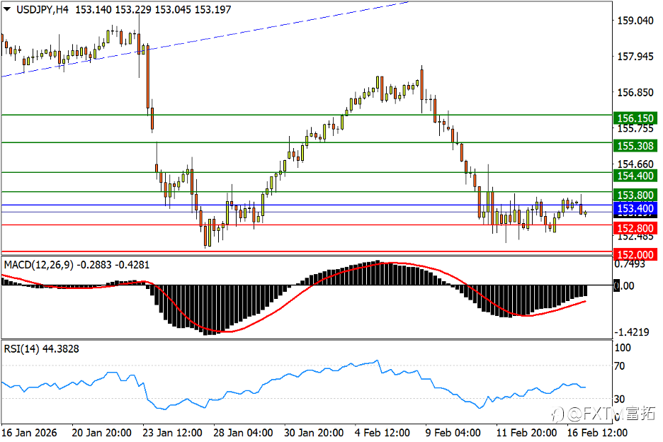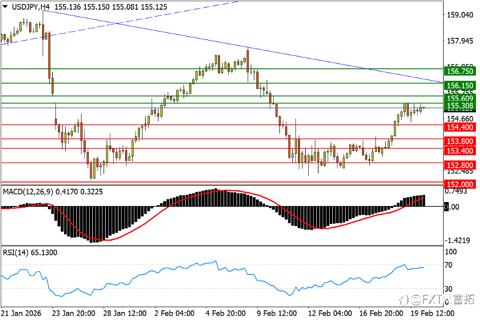 NO.1 美元/日元 (USD/JPY) – 反弹遭遇周线缺口,冲高势头暂时保留 日线图看,低于预期的美国初晴失业金帮助美元固守本周前3个交易日的较大涨幅。美/日小涨重返1月26日当周周线缺口下沿155.30,如果将缺口上沿155.60(也是去年底前回撤低位)封闭,多头反攻将积聚更多信心。后续上行将先后锁定去年12月10日高点/1月6日低点镜像位156.15,以及2024年11月反弹高点156.75。伴随汇价走出双底雏形,MACD指标在零轴下方再度金叉;RSI升至中性区,但尚未全面恢复强势。 4小时图上可以更清晰地观测美/日隔夜在155.30缺口下沿碰壁的过程;如果在现有区域遇阻,