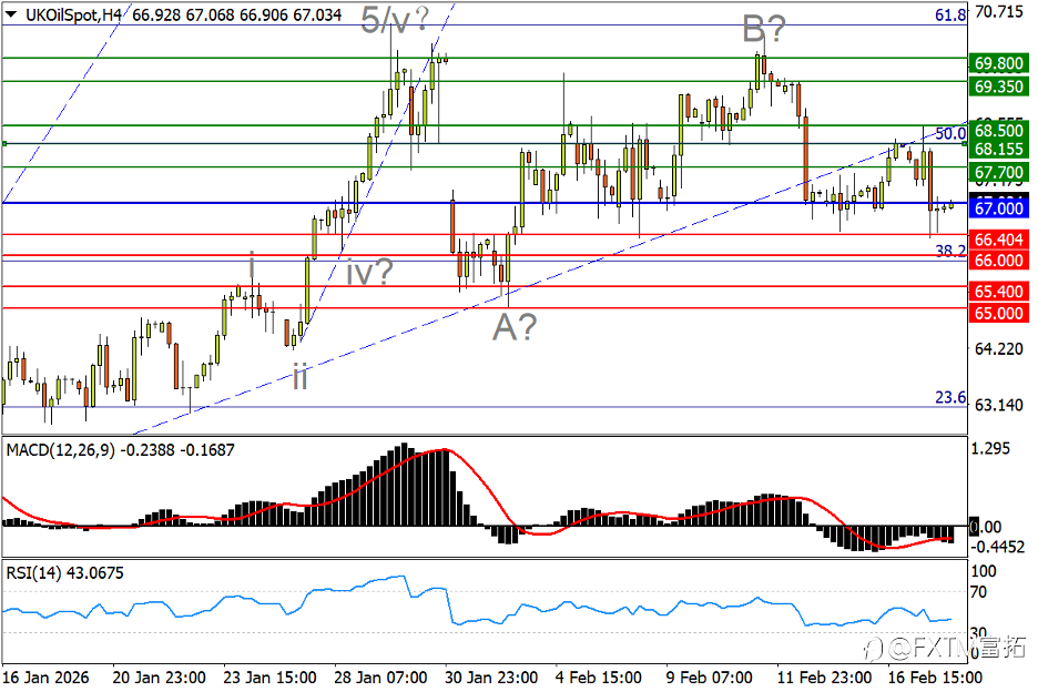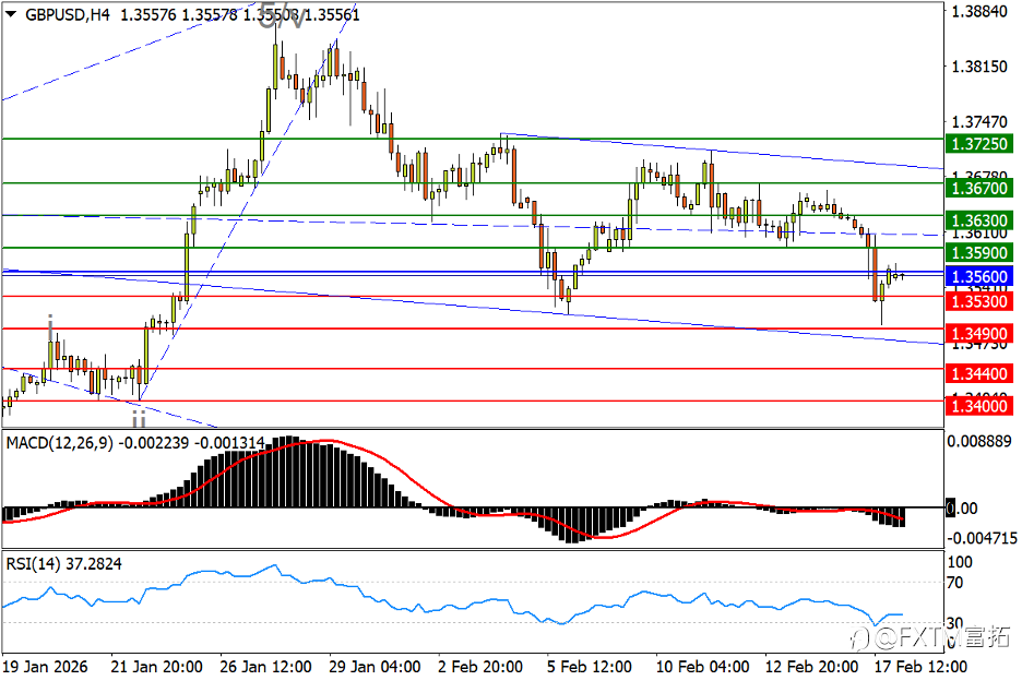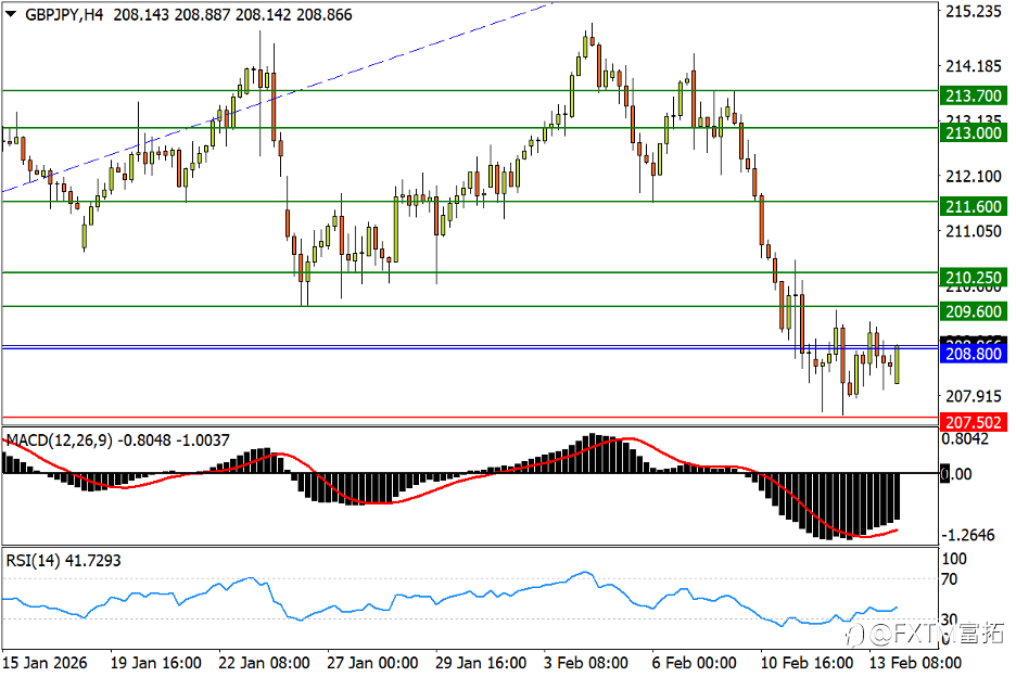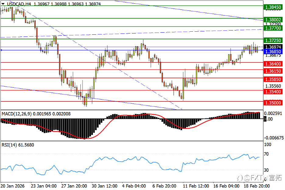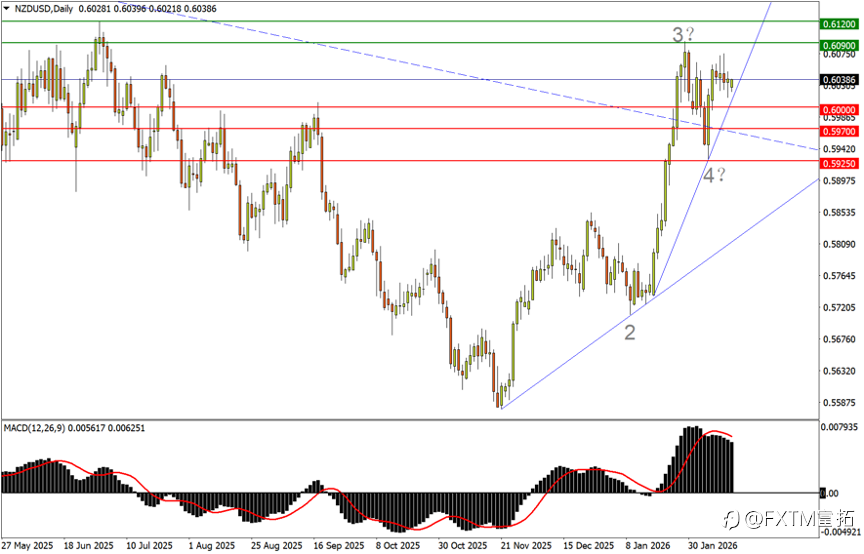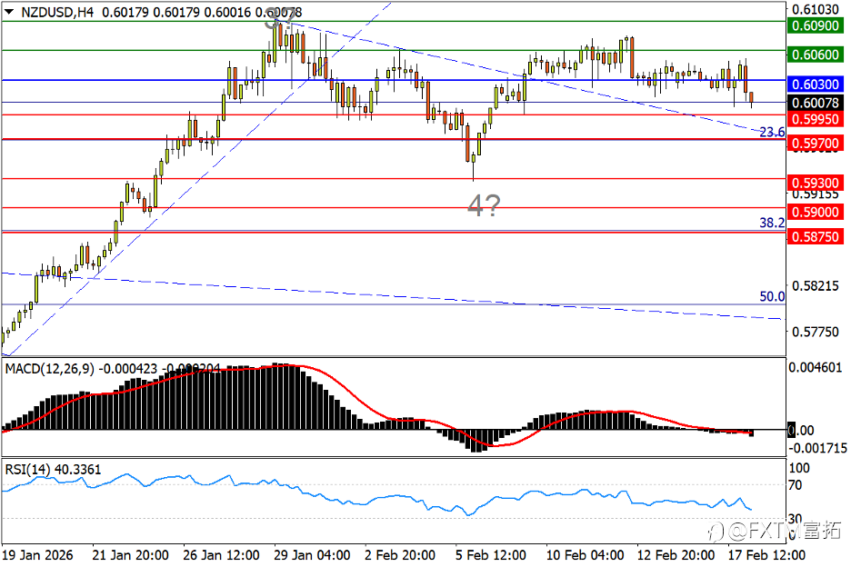 NO.1 纽元/美元(NZD/USD) – 联储姿态有欠强硬,回至近期区间下沿 日线图看,新西兰联储早间如期维持利率不变,但委员们一致认为政策应保持宽松。观点压制纽元下挫,汇价亚市盘中回至两周来的区间下沿。如果继续将0.60关口(在1月26日、2月2日和9日都出现过波段折返)跌漏,即将完全开启调整空间,同时为5浪升势是否启动埋下更大隐患。后续支撑参考去年3季度涨势的23.6%回撤位0.5970,以及24年11月下旬反弹高点0.5930。指标格局流露恶化先兆:MACD高位死叉后持续缓跌;RSI有在强势区向下拐头的迹象。 4小时图看,虽然纽/美盘中跳水,但尚未脱离一周多来横向震荡区间,