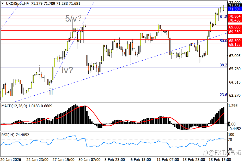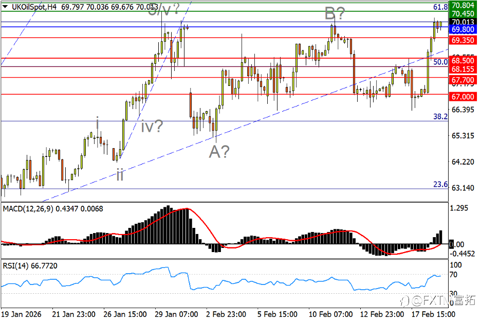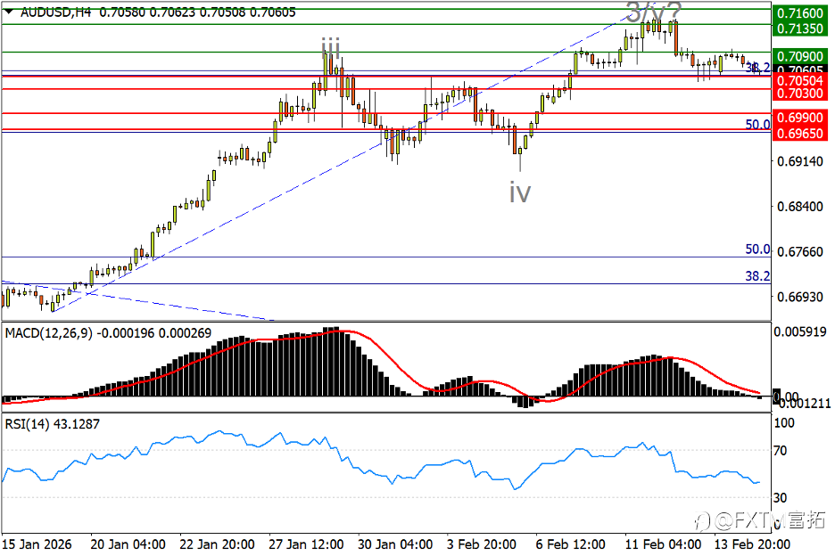 NO.1 澳元/美元(AUD/USD) – W底颈线支撑告急,3浪v疑已走完 日线图看,早盘公布的澳洲联储本月会议纪要并未呈现更多鹰派信息,澳/美早盘依旧温和承压。而浪形上,如果前期W底颈线位0.7050(即2月3日高点,也是20-21年快涨行情的38.2%回撤位)至2020年年初高位0.7030先后跌漏,几乎可宣告去年12月18日起的3浪v走完。后续支撑指向2020年11月低点0.6990,以及2022年1月低点0.6965(接近21-25年跌势的50%回撤位)。指标方面,MACD在零轴上方高位二度死叉;RSI跌破超买线,均为汇价涨势碰壁的迹象。 4小时图看,澳/美亚市在1月高点