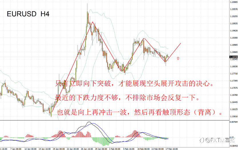 NO.1 欧元/美元(EUR/USD) – 加速跌近本月低点,浪形可能“强弱交替” 日线图看,隔夜美国工业、房产数据强劲,美联储纪要也显示委员通胀担忧重燃,美元因此全面走强。欧/美吞下三周来最大单日跌幅,点位直逼2月6日的波段前低1.1765(也是12月中旬密集高位)。下破将再辟调整空间,进一步蚕食1月下旬快涨行情升幅。更多支撑参考10月20日高点1.1725,以及去年12月19日低点/1月12日高点镜像位1.1700。指标方面,MACD快线加速朝零轴回撤;RSI跌至中性区弱侧,空方优势已消磨殆尽。 4小时图看,欧/美在隔夜加速调整之前,一周多来形成相对平缓的下行通道,结合1月下旬