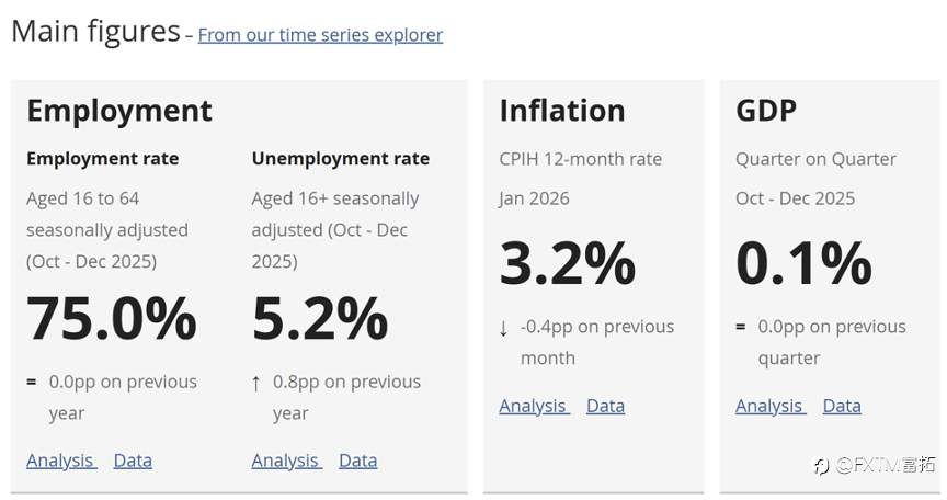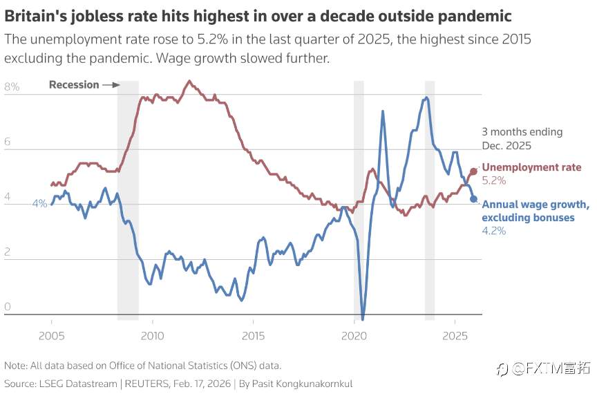 不到一周时间内,英国最新的宏观经济、就业、物价指标先后揭晓。英镑所面对的,到底是怎样的内部经济环境? 经济勉强规避萎缩 上周四(2月12日)公布的英国去年第四季度GDP环比仅增0.1%,比市场预计的+0.2%更弱。12月当月,经济也只小幅增长了0.1%。 统计局还下调了截至11月3个月的GDP,数字从增长0.1%修正为下降0.1%。更加不妙的是,同期人均经济增长率连续第二个季度收缩0.1%,陷入了所谓的技术性衰退。 一系列数据为英国经济充满挑战的一年画上了令人失望的句号。2025全年来看,英国GDP增长了1.3%,低于央行最新预估值1.4%。 在工党支持率持续低迷的情况下,财政大臣瑞秋·里夫斯