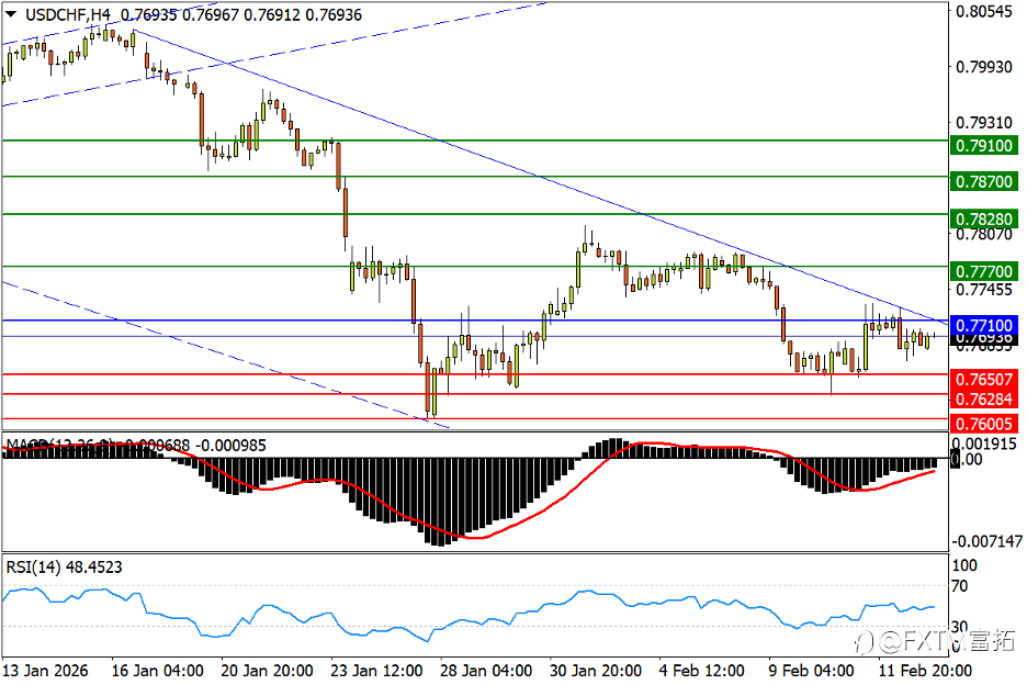NO.1 美元/瑞郎 (USD/CHF) –纠结打造波段次低,仍欠破顶临门一脚 日线图看,美/瑞近来走势整体追随美元大势,汇价本周有探得波段“更高低点”迹象,但很快上行就遭遇到四周跌势上轨。回升前景来看,多方亟需冲破2011年8月低点0.7770,进而颠覆下行节奏。随后2011年8月低点0.7770也是2月上旬的争夺焦点,收复无疑有助反弹推进。更高阻力可参考去年9月录得的全年谷底0.7828,且直至去年7月低点0.7870一线都将抛压沉重。指标方面,MACD在零轴下方缓升,双线粘连;RSI于弱势区震荡,多方起底力度尚显不足。 4小时图看,美/瑞即期在跌势顶边下方依旧表现纠结,顶边之争也将再次决