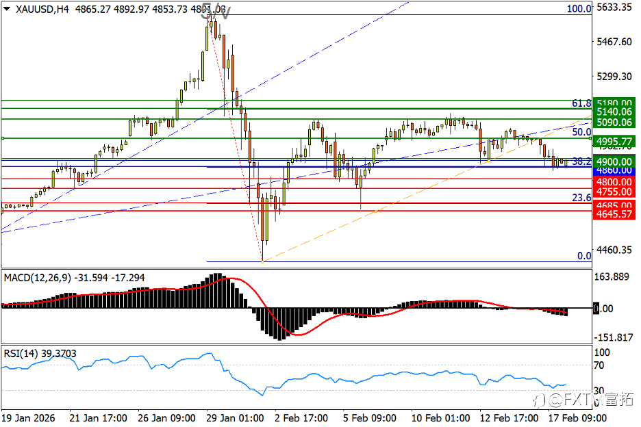 美国股市三大指数12日走势同步重挫,其中道琼工业指数收盘大跌669.42点,跌幅1.34%,标普S&P500指数收盘大跌108.71点,跌幅1.57%,而纳斯达克则是跌势最重,收盘重挫469.32点,跌幅达到2.03%,本周市场焦点美国公布最新非农就业数据,新增13万人优于市场预期,同时1月失业率下滑至4.3%,使得短线美元强势反弹,金价短线激烈震荡,另一方面今晚将公布美国1月消费者物价指数(CPI)年率,提醒市场投资人多加谨慎留意晚间行情波动。 另外,技术分析面切入1小时级别观察美元指数上周一路拉回修正,目前美元触及下方支撑线震荡,等待站稳均线后有望反弹上涨,建议投资人偏多看法为主。