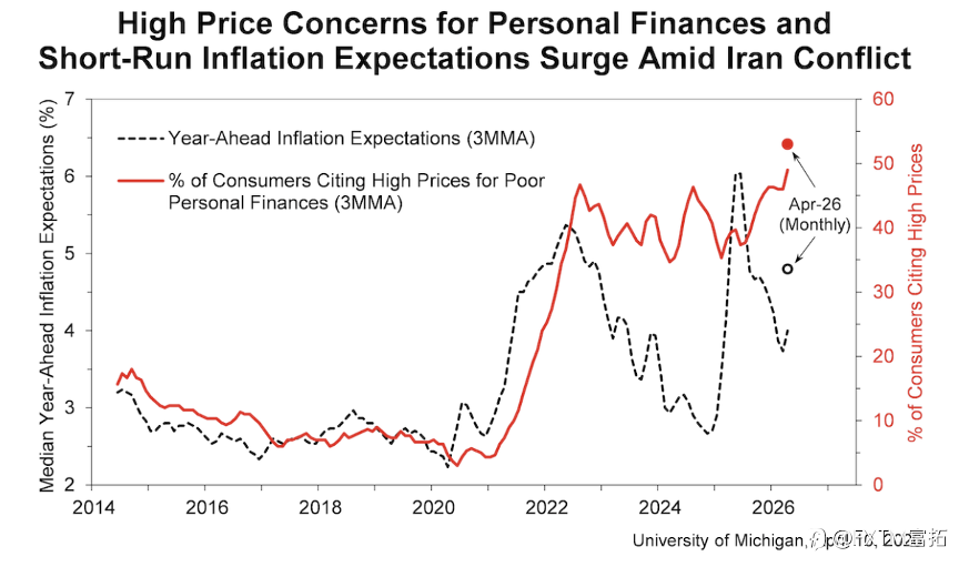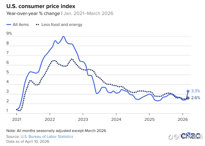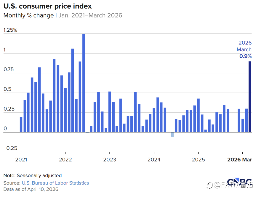 随着美伊战争导致能源成本飙升,美国CPI涨幅在3月提速! 3月季调后CPI月率涨幅为0.9%,增幅是2月的三倍,创下2022年6月来的近4年最高水平; 美国CPI月率变化 来源:BLS、CNBC 与此同时,数据年率增幅来到3.3%的2024年4月来最高。其中汽油价格飙升21.2%成为焦点,占到总体数据涨幅的近3/4。 美国CPI年率变化 来源:BLS、CNBC 即便如此,3月核心通胀却并未同步加速,剔除食品和能源的通胀率月率上涨0.2%,年率涨幅也只微增至2.6%,而且两项指标均略低于预期。 这套数据给市场营造出“物价涨幅仅限于中东危局所波及的能源领域”的印象,甚至在疗、个人护理以及二手车等价