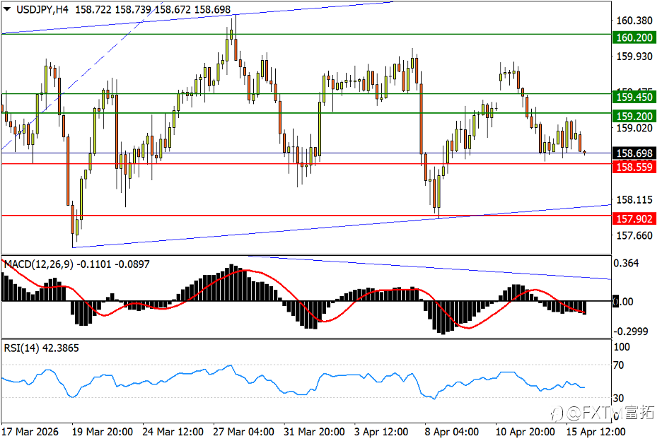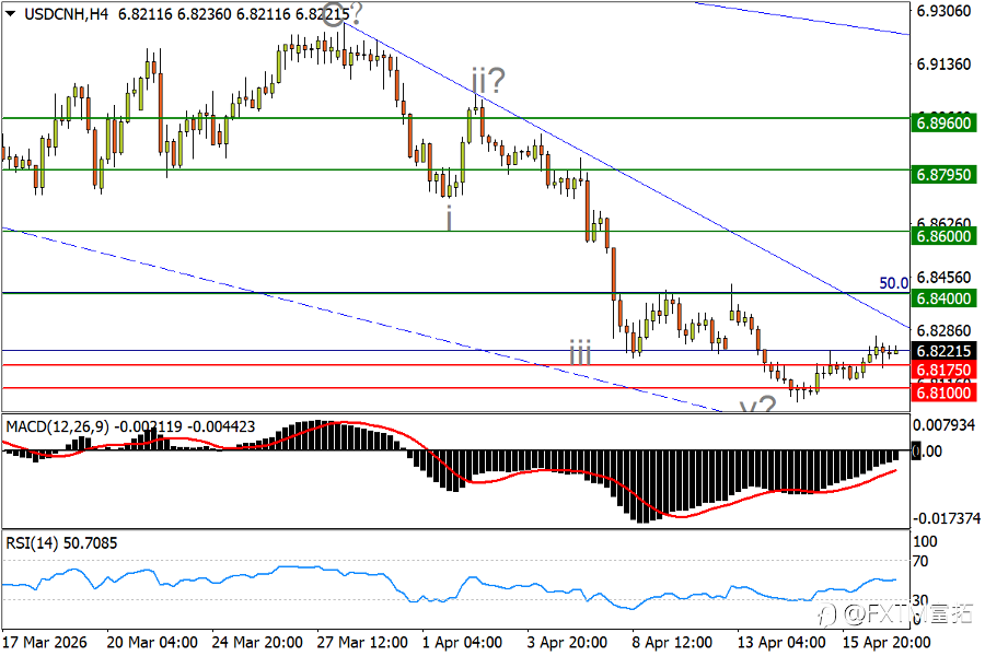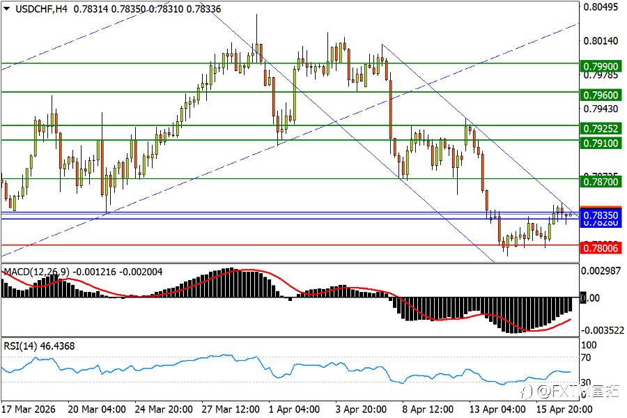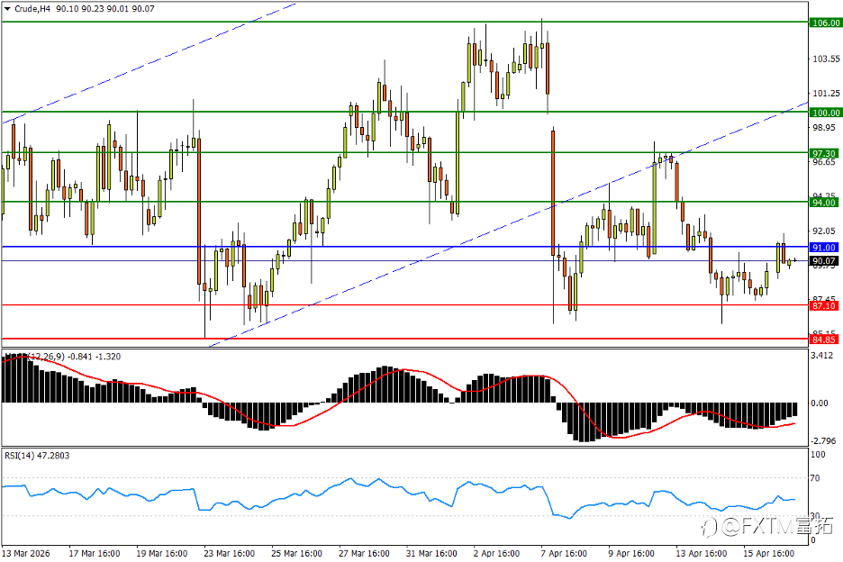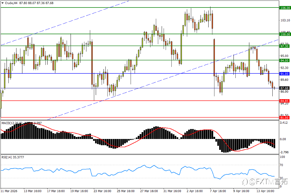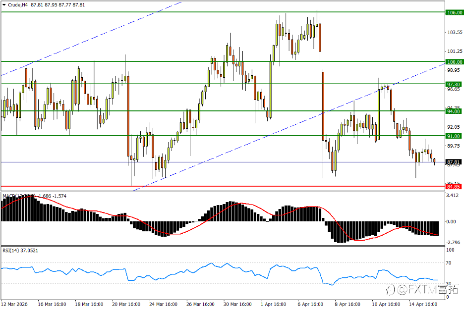 NO.1 美油 (Crude) – 盘中回撤略遇抵抗,打响波段前低决战 美伊和谈机会保留加大油价回撤压力。日线图看,美油隔夜明显回撤后,周三(4月15日)亚市仍有下探惯性。不过在接近4月8日剧震低点,以及3月23日低位84.85上方一带涌现较强的买盘承接。后者跌破恐将按下市场调整的“加速键”,更多支撑先后参考3月11日回撤低点81.00,以及3月10日低位75.75。指标方面,MACD朝零轴的回撤步伐仍未停止;RSI已跌至中性区,提示油价正面临启动战争攻势以来的最严峻挑战。 4小时图看,美油眼下回撤尚未打出短周期波段的“更低低点”,反弹机会来看,如果84.85上方支撑印证为“稳固”