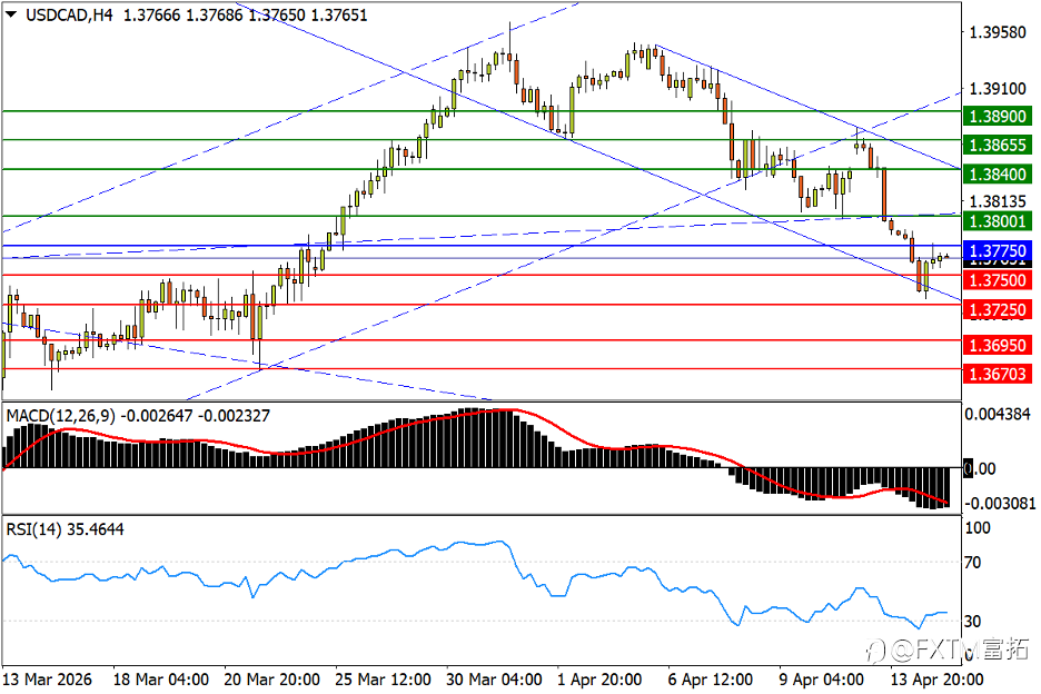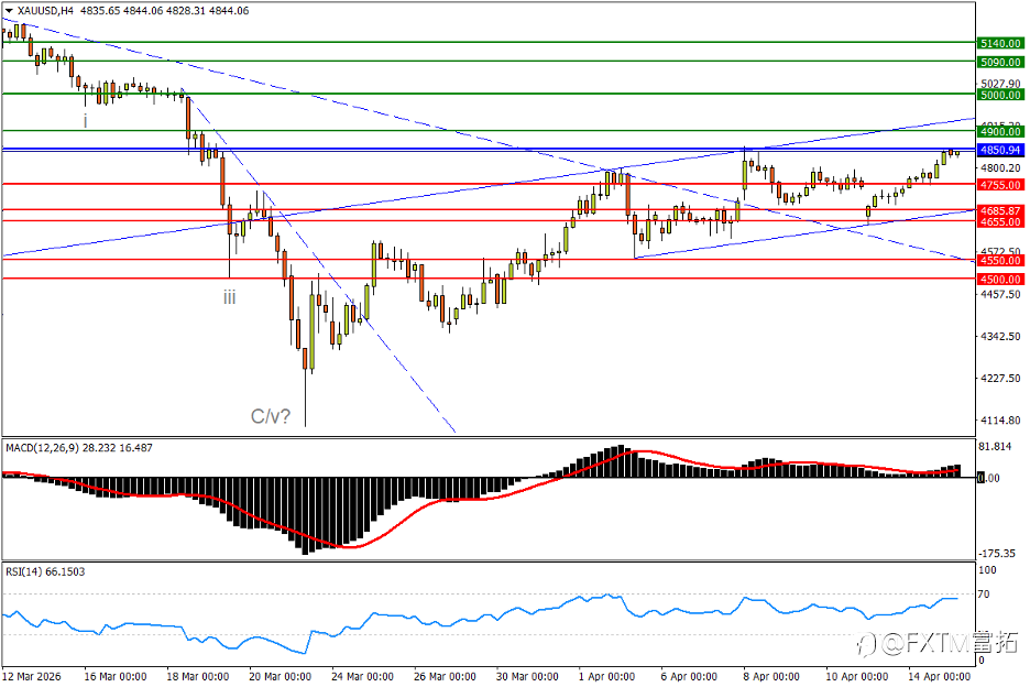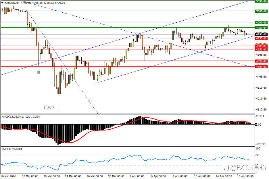 美国股市三大指数16日走势同步上涨,其中道琼工业指数收盘上涨115.00点,涨幅0.24%,标普S&P500指数收盘上涨18.33点,涨幅0.26%,而纳斯达克收盘上涨86.69点,涨幅0.36%,本周市场焦点美国表示将与伊朗进行第二轮谈判,对于核原料等议题为重中之重,同时美国总统特朗普表示对于停火协议有望延续,使得本周股市行情延续涨势再创历史新高点。 另外,技术分析面切入1小时级别观察美元指数符合上周预测大幅下跌,目前美元呈现大型空方头部架构,等待弱势反弹遇压后再次向下修正,建议投资人偏空看法为主。 技术分析(黄金XAUUSD) 技术分析面切入,1小时级别观察黄金走势上周持续小幅反弹