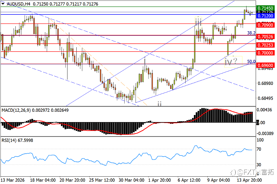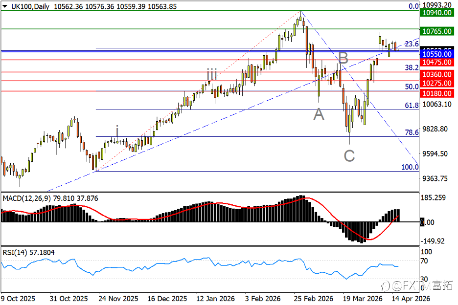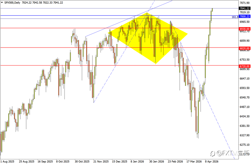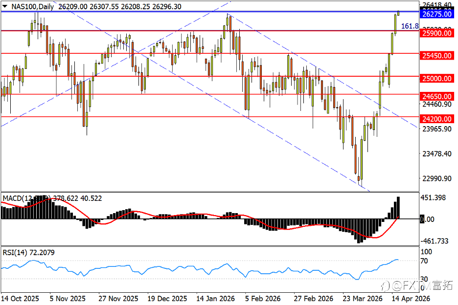 NO.1 纳斯达克100指数(NAS100) – 双重利好强推,完成V转拿下新高 日线图看,美伊谈判前景的乐观预判,以及银行股强劲财报强力提振美股信心,在标普顺利攻下新高的同时,纳指100攻破纪录峰值26275也是不在话下。走势来看,纳指上破2月起跌势上轨后,始终保持衔枚疾进的强攻模式。更高点位目标来看,27000关口,以及去年11月回撤行情的逆向1.618倍映射位27775预计将有抛压涌现。反观回撤风险,由于RSI已探入超买区,MACD的双线张口也伴随股指连日急拉显著扩大。因此如果股指回撤跌破1月中旬高位区25900,就需格外警惕调整风险是否放大,而在形态上市场也将因此浮现三重顶